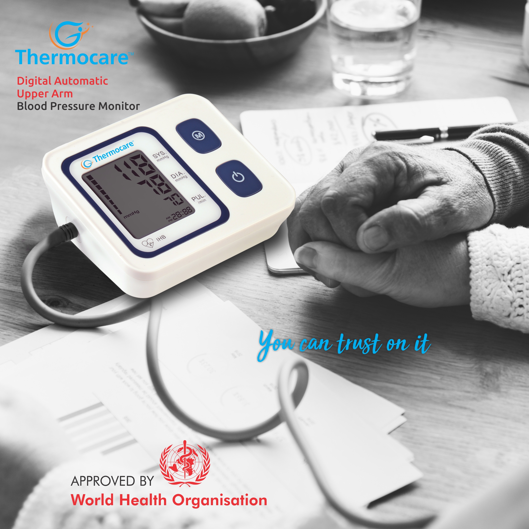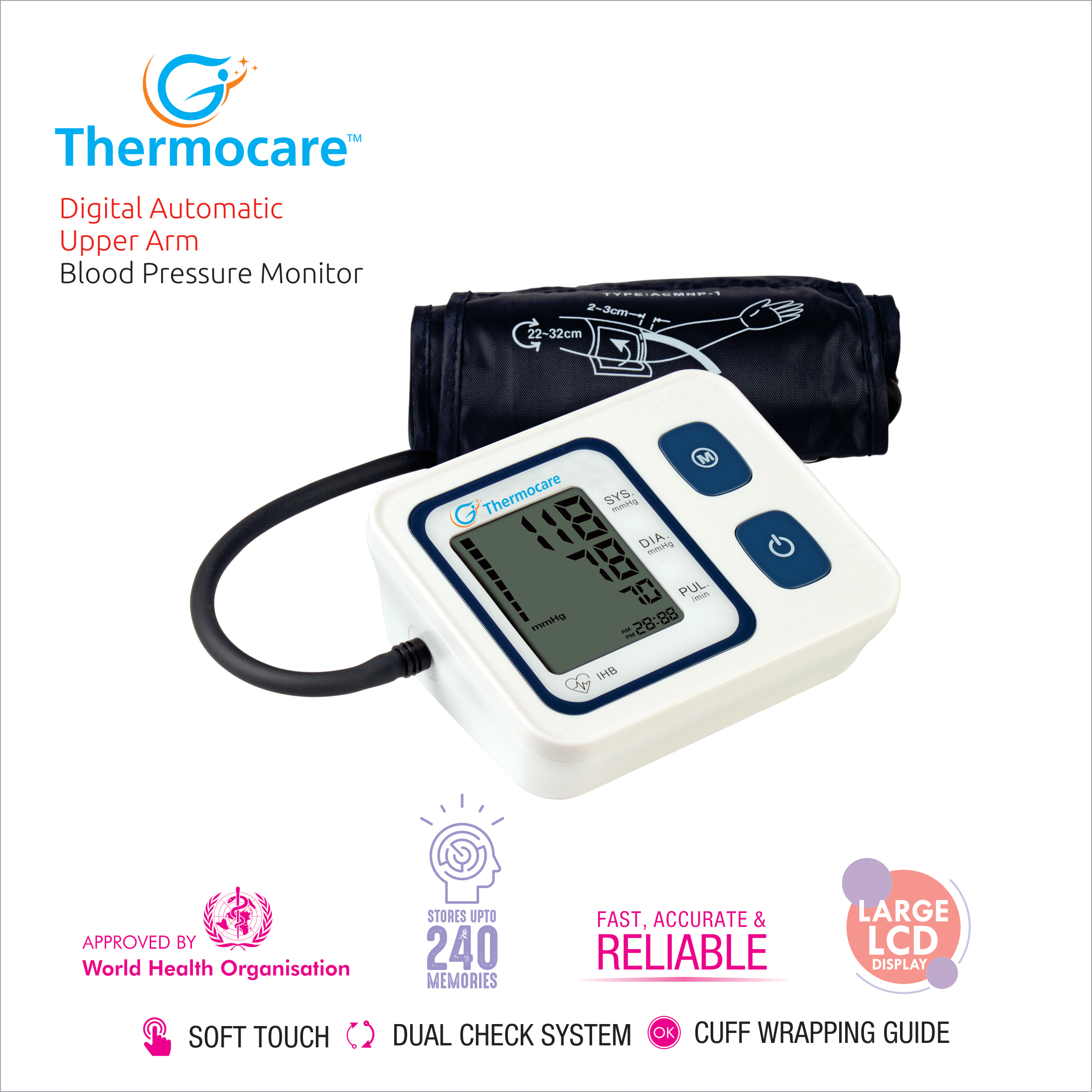Thermocare Digital Blood Pressure Monitor uses the oscillometric method of blood pressure measurement. This means the monitor detects your blood's movement through your brachial artery and converts the movements into a digital reading.This Automatic blood pressure monitor could measure the systolic pressure, diastolic pressure and plus, the components are included the body, cuff and printed instruction manual. Batteries and adaptor are optional. This unit is intended for the adult using.1*199 sets memory function, each measurement result will be displayed on the screen and automatically stored. This unit has blood classification index, could easy to check your blood pressure. Please read the manual carefully before you use the unit, and keep the manual well after using.